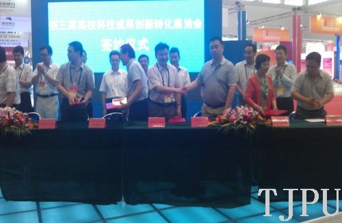 在高校科技成果创新转化展洽会签约仪式上,全市高校有18 项科技成果转化项目签约,市教委副主任韩金玉出席仪式并致辞,他充分肯定了参会高校所展示的科技成果,并预祝展洽会圆满成功。市教委科技处处长林列、副处长阮彭涛、各有关高校领导也出席了签约仪式。我校校长助理、科技处处长程博闻在签约仪式上代表我校与天津中天瑞泰安全设备有限公司签署了技术转让合同。仪式后,韩金玉副主任、林列处长在科技处人员的陪同下听取了我校的项目介绍并观看了实物展示,对我校的产学研工作给予了肯定并对我校参展工作表示满意。