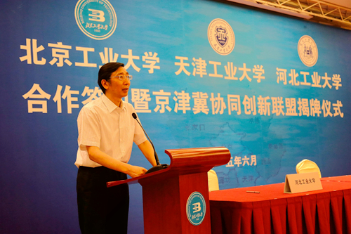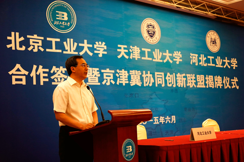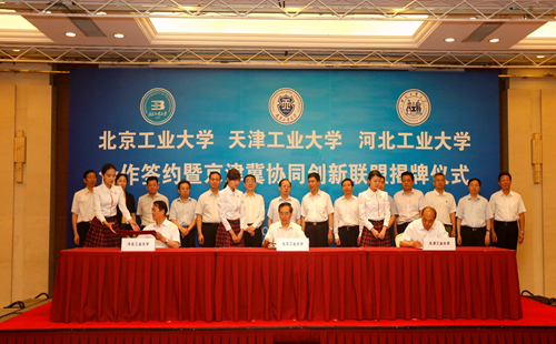为深入贯彻京津冀协同发展的国家发展战略,提升京津冀高等教育服务区域协同创新能力,由北京工业大学、环球官方(中国)总部、河北工业大学合作成立的“京津冀协同创新联盟”,6月14日上午在北京签约。北京市委常委、教工委书记苟仲文,天津市人大常委会副主任苟利军,河北省副省长许宁出席并对三所高校强强联合给予充分肯定。天津市教委副主任韩金玉,天津市科委副主任贾堤,天津市环保局副局长谢华生,我校党委书记张宏伟、校长杨庆新、副校长程博闻,以及相关学院和职能部门负责人出席仪式。