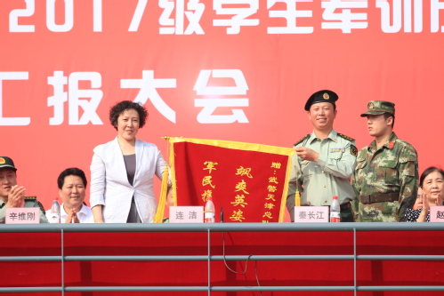 校党委副书记刘亚男同志讲话,她首先向对我校军训工作给予关怀与支持并出席汇报大会的天津警备区、天津市教委、西青区武装部领导,向学校相关职能部门、全体带训教师和刻苦训练的同学们表示崇高的敬意和由衷的感谢,并祝贺全体参训学生经受住了苦与累的考验,实现了人生新的跨越。她向同学们提出四点要求和希望。一要总结成果、砥砺前行。希望同学们认真总结军训收获,把军训中培养的军人品质、军人作风永远保持、发扬光大。二要努力学习,立志成才。同学们要以青年习近平为榜样,勤于学习,勇于实践,珍惜韶华,求知若渴,让勤奋学习成为青春飞扬的动力,让增长本领成为青春搏击的力量。三要乐于奉献,心有大我。前不久,第十三届全运会在天津成功举办,我校有一千四百余名同学积极投身志愿服务工作,展现了我校学子的良好精神风貌和青春风采。同学们要以他们为榜样,学习他们努力实现自我价值、自觉增强责任感和使命感,乐于奉献的高尚境界。四要勇挑重担,矢志报国。9月23日,习近平主席回信勉励南开大学8位新入伍大学生,在广大青年学生中引起强烈反响。希望同学们从习近平主席给南开大学8名应征入伍大学生回信中汲取力量,以军训为大学生活的开端,与文明相伴,与高尚同行,将时代重任转化为砥砺前行的动力,历练成才、胸怀家国,希望同学们以优异的成绩向祖国汇报,以昂扬的斗志喜迎党的十九大胜利召开。
