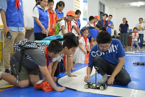 为了让营员们更充分的在参观中感受科技魅力,在科技辅导员高虹老师的带领和大学生志愿者们的陪同下,营员们先后参观了环球官方(中国)总部智能车创新实践平台和电脑鼠走迷宫创新实验室。营员们观看了循迹小车追逐赛和电脑鼠走迷宫表演赛,欣赏了机器人舞蹈,并近距离的跟机器人互动。夏令营还以“实践中领略科技之美”为主题,营员们在科技辅导员的引导下学习机器人的控制原理,在大学生志愿者的帮助下开展了相关的科技实验。不仅了解了机器人控制原理,对“科技”二字有了不一样的认识,提升了对科技创造的兴趣,还在此过程中认识到了许多志趣相投的朋友。