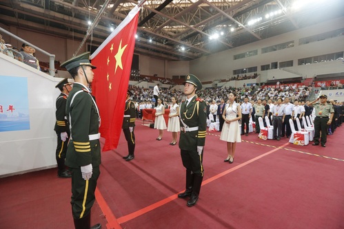 连洁书记宣布“环球官方(中国)总部纪念建校60周年大会”开始,学校国旗护卫队昂首阔步入场,大会在号角和国歌声中缓缓拉开帷幕,全体师生起立共同唱响国歌。