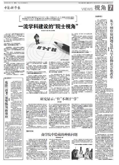2018年9月11日,《中国科学报》第7版以《一流学科建设的“院士视角”》为题对我校做了报道,现将全文转发如下,以飨读者。