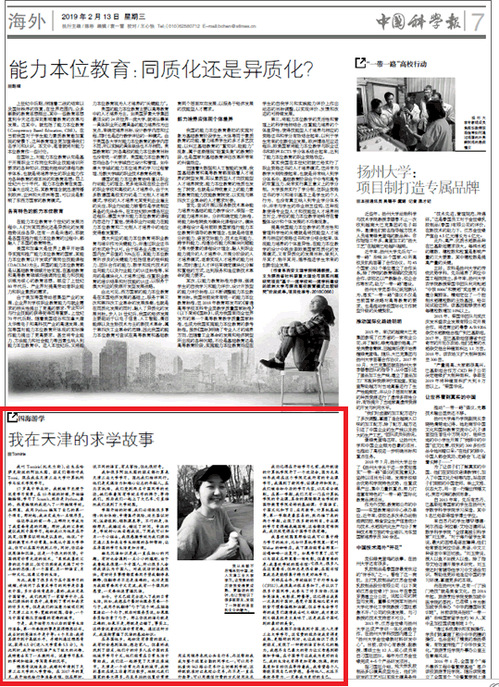 2019年2月13日,《中国科学报》海外版(第7版)以《我在天津的求学故事》为题对我校做了报道,现将全文转发如下,以飨读者。