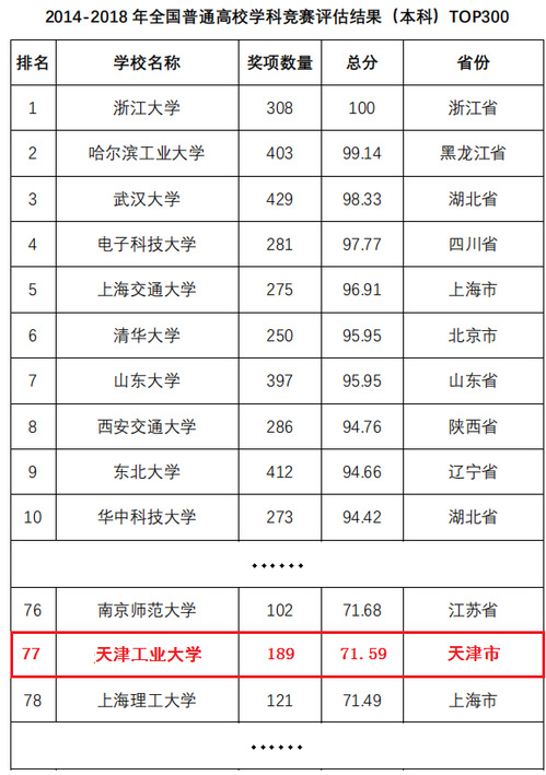 2019年2月22日,“2018全国普通高校学科竞赛排行榜”由中国高等教育学会在浙江理工大学重磅发布。我校在“2014-2018年全国普通高校竞赛排行结果(本科)”中位列第77名;在“2018年全国普通高校竞赛排行结果(本科)”中位列第55名,取得天津高校最好成绩。