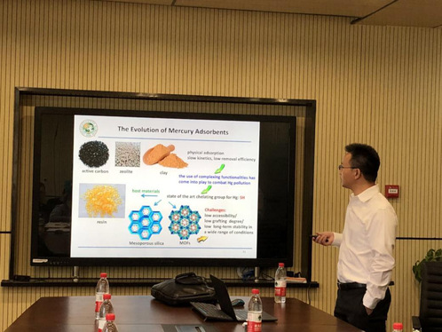 报告会上,马胜前教授详细介绍了定向设计和多孔有机聚合物材料的功能化在水处理方面的研究意义、定向设计思路以及具体的水处理方面研究。在多孔有机聚合物在海水中油污去除应用方面,马教授团队从材料的设计制备来入手,关注疏水功能化基团的引入改善油污的处理效率,通过调节材料内部的孔道结构以及作用位点,大大改善材料的实际应用价值。随后,进一步通过对材料后合成修饰处理,增加各种功能基团,实现材料在各种水环境的稳定性。此外,通过设计有机多孔材料,引入携带负电荷的特种官能团,所得材料在汞离子吸附脱除、金属铀提取和核污染治理等方面表现出很高的吸附分离性能。