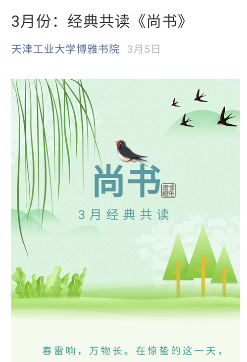通过学习平台每月推出一本共读经典,本学期分别读了《诗经》《尚书》《礼记》《周易》《春秋》,2600多名学生参加了经典共读。读完之后进一步做读书分享,各学院总计推出37期微信公众推文,分享读书心得,记载了453名同学的读书收获。