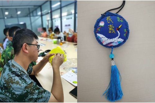 感恩手绣:在天津津派旗袍第四代传承人房老师的指导下,不善于用针线的同学们也绣出了自己满意的小作。“临行密密缝,意恐迟迟归”,同学们在一针一线中理解了父母默默无声的辛苦付出。