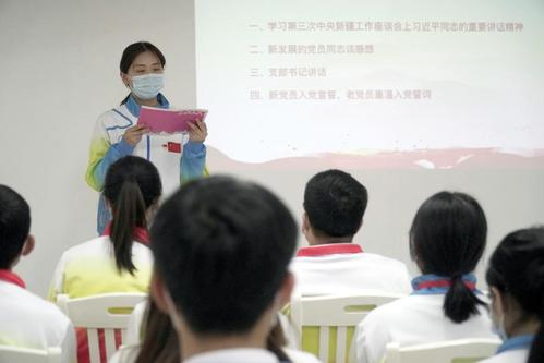随后,临时党支部书记王丽伟为全体党员上了一堂微党课,共同回顾了中国共产党带领中国人民经过浴血奋战建立新中国的历史,以及新中国成立后取得的新成就、新变化,并要求全体党员,一是要牢记共产党人的初心使命,将个人梦想与国家发展、民族团结紧密结合在一起,勇担青年使命,不辜负党和国家的重托;二是要发挥党员先锋模范作用,一名党员就是一面旗帜,要旗帜鲜明讲政治,在困难面前要挺身而出,团结带领支教团团员青年携手完成此次支教任务;三是支教工作中要秉持“三心”理念,要常怀一颗民族团结的大爱之心,用爱心暖童心,用细心待诚心,用耐心伴真心。最后她勉励全体党员勇于攻坚克难,在困难中淬炼品质,在奉献中进步成长。