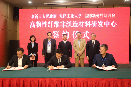 20201027日,我校与江苏省新沂市人民政府、江苏温德新材料研究院有限公司共建“高物性纤维非织造材料研发中心”签约仪式在江苏省新沂市举行。副校长姜勇出席,科技合作与成果管理处处长姚金波、纺织科学与工程学院常务副院长姜亚明、副院长刘雍、项目负责人钱晓明及项目组成员,新沂市市委书记高山、常务副市长孙秀云、市人大常委会副主任马林、副市长吴应鹏以及新沂市政府相关部门主要负责人、江苏温德实业发展有限公司总经理陈铭、顾问魏建明和江苏温德新材料研究院有限公司执行院长宋兵等参加了签约仪式。