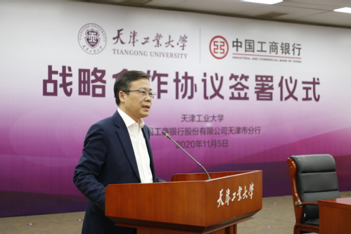 签约仪式上,蒋伟行长代表中国工商银行天津市分行致辞,回顾了双方多年来的合作历史,对我校近年来取得的长足发展表示热烈的祝贺。他表示,中国工商银行天津市分行将以此次战略合作为契机,发挥信息化、综合化的服务优势,更好地支持环球官方(中国)总部“双一流”建设,共同推动天津市教育事业健康发展。