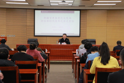 白海力副主任围绕“把握百年未有之大变局,担当新时代青年之历史责任”这一主题,从正确把握世界百年未有之大变局的时代大势,深刻认识中国特色社会主义制度的优越性,全面理解坚持爱党、爱国、爱社会主义的高度统一,做新时代爱国奋斗精神的模范践行者等四方面进行了深刻阐述。他寄语同学们:一要树立坚定理想信念,树立远大理想,做胸怀天下的践行者;二要练就过硬本领,加强个人修为,做全面发展的奋斗者;三要做有一技之长、对社会有贡献的人,不畏艰难,求真务实,把人生过得精彩,为实现党的十九届五中全会确定的“十四五”规划任务和二〇三五年远景目标,为国家的繁荣富强贡献自己的力量。