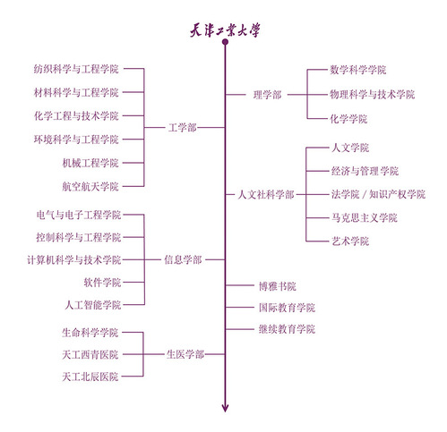 整合优化学科专业资源,设立五个学部:理学部、工学部、信息学部、人文社科学部、生医学部。理学部设数学科学学院、物理科学与技术学院、化学学院;工学部设纺织科学与工程学院、材料科学与工程学院、化学工程与技术学院、环境科学与工程学院、机械工程学院、航空航天学院;信息学部设电气与电子工程学院、控制科学与工程学院、计算机科学与技术学院、软件学院、人工智能学院;人文社科学部设人文学院、经济与管理学院、法学院/知识产权学院、马克思主义学院、艺术学院;生医学部设生命科学学院、天工西青医院、天工北辰医院。省部级及以上重点实验室、研究中心等分别纳入相应学部。博雅书院、国际教育学院、继续教育学院单列。