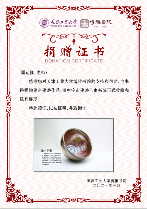 下午2点,建盏捐赠仪式在博雅报告厅隆重举行,我校副校长姜勇,“建窑建盏烧制技艺”非物质文化遗产代表性传承人杨敏,建盏烧制技艺代表性传承人高邵雄,福建省南平市建阳建盏青年新秀游超,我校校友工作办公室、博雅书院、图书馆等单位负责同志,我校校友万长铭,南开大学文学院教师吴若明,天津科技大学艺术学院教师张新沂,茶文化爱好者共50余人出席了捐赠仪式。杨敏、高邵雄、游超、周运隆、余奇骏五位老师向学校捐赠了专门制作的雀影惊鸿、金凤凰天目金盏、扶摇、点茶盏、火莲系列支钉烧建盏等25件作品,为学校和广大师生献上一份厚礼。