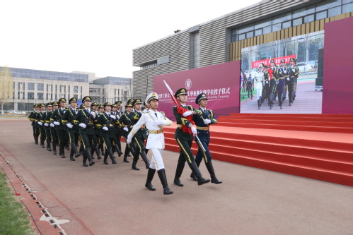 毕业典礼正式开始,国旗班举行庄严的升旗仪式,全场起立集体高唱国歌。出校旗,奏唱校歌。