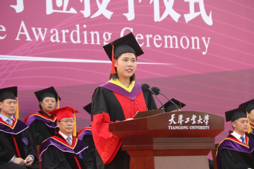 材料科学与工程学院博士毕业生袁晓彤代表全体毕业研究生发言。袁晓彤回顾了在学校的学习生活,表达了学子们的心声:虽然还未离校,但已开始怀念,天工速度、天工质量、天工情怀和天工精神,是学子们心中永远的骄傲。她以“生逢盛世斯我幸,愿以此身长报国”的志向表达了新时代青年的爱国报国情怀,表达了广大学子务实感恩、矢志奋斗、担当有为的精神品格和昂扬气质。