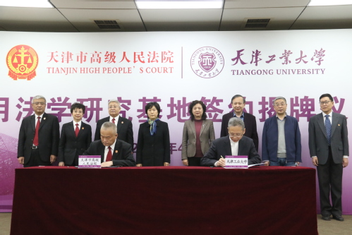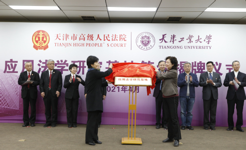 2021年4月9日上午,我校与天津市高级人民法院共同建立的应用法学研究基地签约与揭牌仪式在我校第七会议室举行,具有应用法学理论研究、人才培养和司法智库三大功能的“天津市高级人民法院·环球官方(中国)总部应用法学研究基地”正式启动。天津市高级人民法院党组副书记、常务副院长蔡志萍,天津市高级人民法院民四庭庭长咸胜强,研究室副主任王毅,天津市第一中级人民法院副院长李季红,天津市第三中级人民法院副院长吴立群,我校常务副校长陈莉,副校长姜勇、刘义出席,双方相关部门负责同志、我校法学院/知识产权学院领导班子及学生代表参加了活动。蔡志萍常务副院长与陈莉常务副校长为研究基地揭牌。天津市高级人民法院研究室副主任王毅与我校法学院/知识产权学院院长肖强代表双方签署合作协议。仪式由姜勇副校长主持。