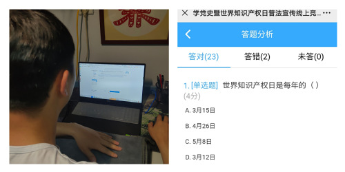 开展世界知识产权日普法线上竞答活动。4月25日至30日,结合学校党史学习教育,以世界知识产权日为契机,法学院/知识产权学院推出了“学党史 悟思想 办实事 开新局”暨世界知识产权日普法线上竞答活动,试题内容涉及党史、民法典、著作权法、专利法、商标法等相关知识。师生们热情高涨、广泛参与,学习党史、领悟新知,通过竞答形成比学赶超的浓厚氛围。