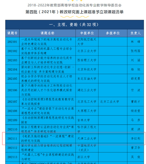 2021年8月11日,第四批(2021年)全国自动化专业教育教学改革研究课题立项名单公布,控制科学与工程学院教师李红利申报的课题“《电机及拖动基础》‘一流课程’建设的研究与实践”获批立项资助。此次课题全国共批准立项63项,其中资助32项,天津市获批资助立项2项,我校1项。