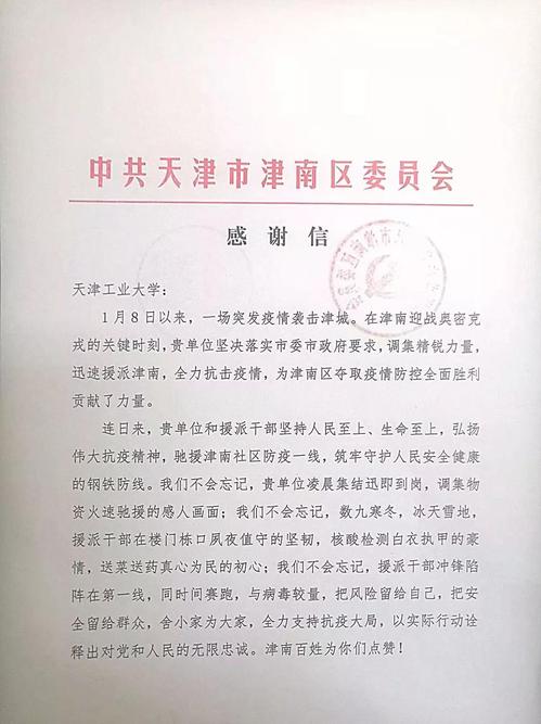 近日,学校收到了津南区委、区政府发来的感谢信,对我校和援派干部教师在津南区疫情防控中作出的贡献表示了感谢。