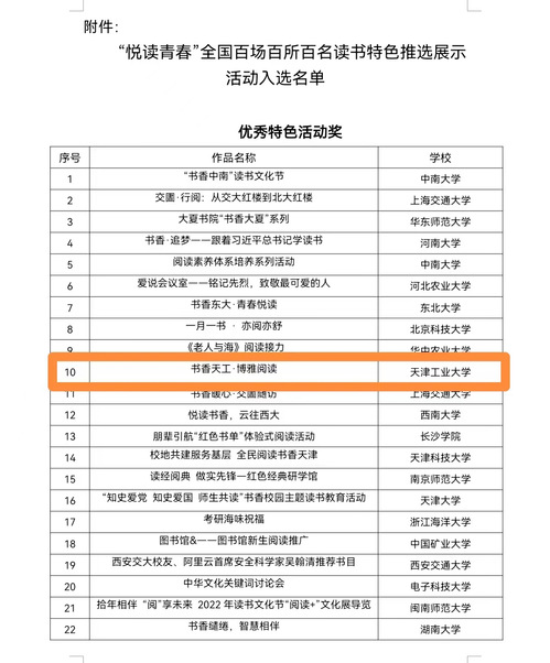 近日,教育部中国大学生在线公布《“悦读青春”全国百场百所百名读书特色推选展示活动入选名单》,我校选送的读书活动《书香天工·博雅阅读》荣获“优秀特色活动奖”。