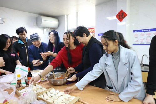 在这个春节,除了坚守岗位的一线员工外,还有四十余名留学生留校过年。为丰富在校留学生的校园生活,增加对中华传统文化的认同感,学校组织了形式多样的慰问和迎春活动,如包饺子、写春联等,让同学们感受到了浓浓的中国年味。慰问中,沈江书记还和留学生一起包饺子,现场充满着欢声笑语,其乐融融。