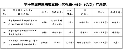 近日,天津市教育委员会公布了第十三届天津市级本科生优秀毕业设计(论文)评审结果,我校共有3篇获选,居市属高校前列。获奖名单如下: