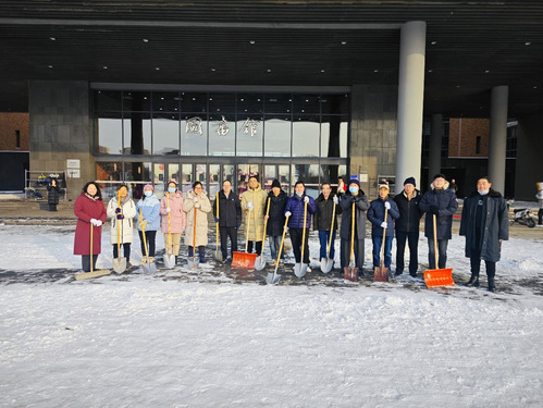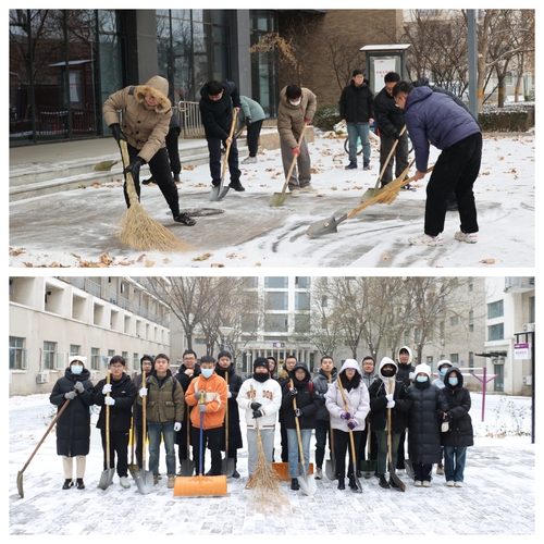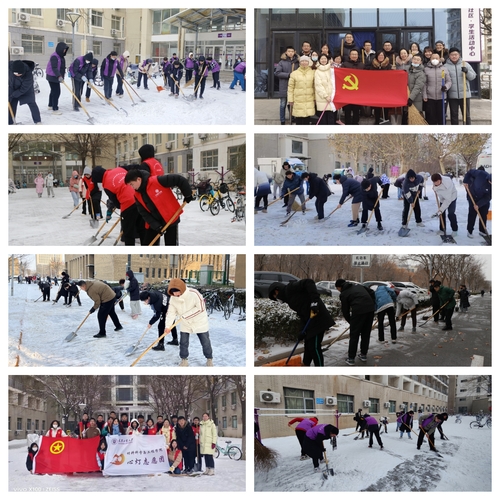 与此同时,各学院也在组织师生开展清雪工作。大家齐心协力,配合默契,干得热火朝天,忙碌的身影构成了一道道亮丽的风景线。