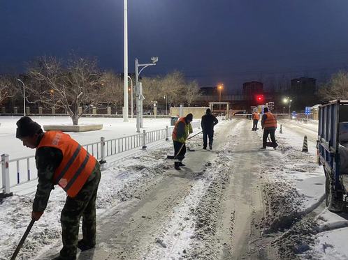 “哧哗!哧哗!”后勤管理处的环卫工人们早早地就抄起除雪工具,整齐划一的清理起主干道上的积雪。“先抱团、再堆砌、走你!”这一套行云流水的动作下来,路基又恢复了往日的容颜。“滴滴!”路过的车辆鸣笛示意,仿佛是给环卫工人们一个大大的点赞。