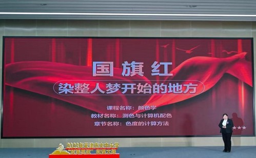作品《国旗红——染整人梦开始的地方》以不同年代“国旗红”与“染整人”之间的故事为主线,在讲授《颜色学》课程知识的同时传递出强烈的专业自信和浓浓的家国情怀。比赛现场,赵晋老师娓娓道来、声情并茂,讲述了从新中国第一代“国旗红”染料的研发到月球表面“国旗红”的实现过程,在让学生了解传统工业领域中的前沿科技同时,更激发了青年学子建设社会主义现代化强国的使命感和责任感。