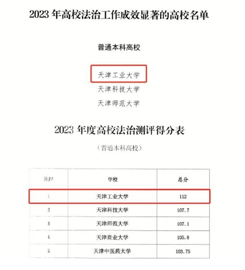 近日,市教委公布了2023年度天津市高等学校法治工作测评结果,我校以112分的总成绩位列全市49所参评高校第一名。这是继2021年连续两年获得佳绩以来,我校再次在该项工作中取得优异成绩。学校也因法治工作成效显著,在市教育系统内获得通报表扬。