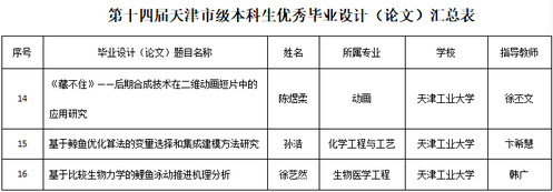 近日,天津市教育委员会公布了第十四届天津市级本科生优秀毕业设计(论文)评审结果,我校有3篇论文获选。获奖名单如下: