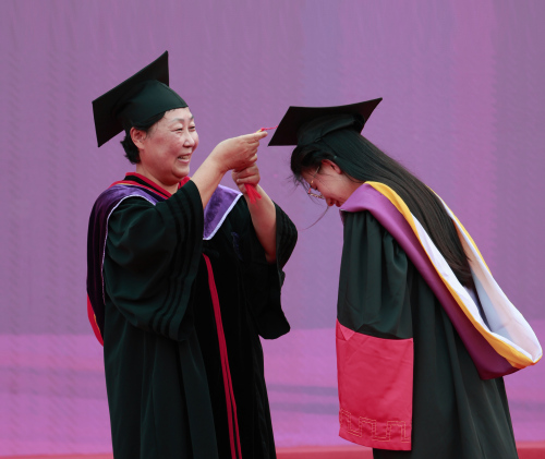 伴随着欢快的乐曲,校领导和校学位评定委员会成员代表为每位毕业生逐一拨穗正冠并合影留念。