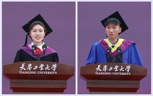 经济与管理学院张宇晨代表全体本科毕业生深情回顾了在学校学习成长的历程,表达了对学校的感恩与惜别之情,并送上对学校的美好祝愿。电气工程学院李宇鸿代表全体研究生毕业生发言,他分享了自己在天工七年的成长与收获,表达了弘扬天工精神,奋发有为,争做时代新人的决心和信心。