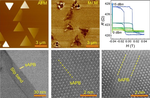 图2. 通过CVD方法合成的具有室温磁性的Fe3O4纳米片,结构上存在反相边界特征,以及微波场辅助下的电阻多级翻转状态。