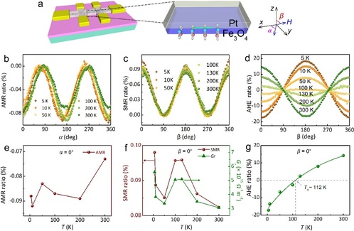 图3. 温度依赖的电输运特性在Pt/Fe3O4霍尔器件。a) Pt/Fe3O4霍尔条形器件的示意图。b) 在不同温度下,AMR与xy平面角度α的关系。c) SMR与d) AHE作为磁场与z方向之间角度β的函数,在不同温度下的表现。AMR、SMR和AHE分别通过以下公式提取:[Rxx − Rxx(α= 90°)]/Rxx(α = 90°)、[Rxx − Rxx(β= 90°)]/Rxx(β = 90°)和[Rxy − Rxy(β = 90°)]/Rxy(β= 90°)。e) AMR、f) SMR和Gr、以及g) AHE与温度的依赖关系,其中α或β为零。