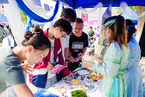 在民族文化展区,身穿民族服饰的学生们,向前来的师生热情介绍各自民族的特色服饰、食品。藏族学生身着斑斓色彩的藏袍、满族学生头扎风韵独特的旗头、回族学生带来让人垂涎的油香……同学们以现场互动的形式,展示了我国少数民族文化的多样与绚丽。