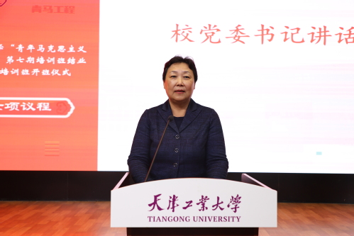 第八期学员代表王巧妍从第七期学员代表戚茸妍手中接过“青马工程”培训班班旗,标志着“青马工程”第八期培训班正式启动。李云龙同学代表第八期培训班学员作了发言。同学们用诗朗诵《奋进新时代 砥砺新征程》和一首《少年中国说》表达了青马学员的爱党之情、强国之志。