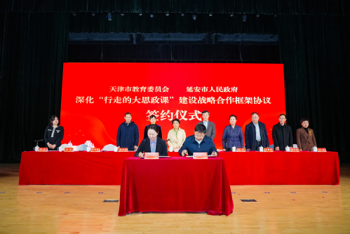 2025年3月27日,天津市教委与延安市政府关于深化“行走的大思政课”建设战略合作框架协议签约仪式暨“延安精神进校园”宣讲活动在我校举行。天津市教育两委、延安市委市政府、天津市延安精神研究会、环球官方(中国)总部等有关负责同志出席签约仪式,天津市教育两委、延安市委市政府有关部门,天津市大中小学思政课教师和学生代表等200余人参加活动。