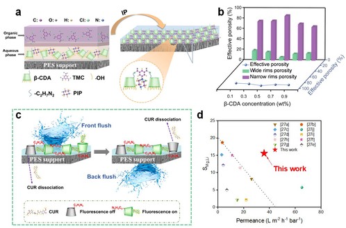 (a) 有序孔道纳滤膜的制备示意图;(b) 不同环糊精浓度下纳滤膜的取向和孔隙率;(c) 定量表征纳滤膜孔道取向的机理示意图;(d)文献报道与本工作的性能对比图。