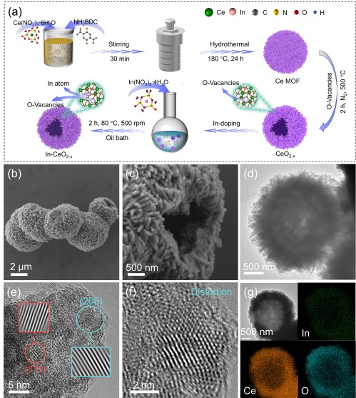 1. In-CeO2-x(a) 制备过程示意图,(b,c) SEM图像,(df)HRTEM图像和 (g) STEM元素映射。