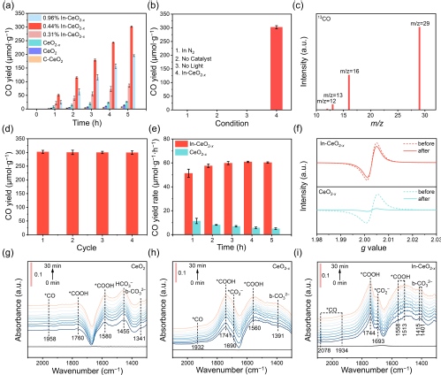 3. (a) C-CeO2CeO2CeO2-xIn-CeO2-x的光催化活性比较。(b)不同条件下In-CeO2-x的光催化性能。(c) In-CeO2-x13C同位素标记试验。(d) In-CeO2-x的稳定性试验。(e)光催化CO2CeO2-xIn-CeO2-x上转化过程中CO生成速率的演化。(f)光催化CO2还原前后CeO2-xIn-CeO2-xEPR光谱。(gi)随辐照时间增加,CO2光还原在(g) CeO2(h) CeO2-x(i) In-CeO2-x上的原位漫反射红外光谱