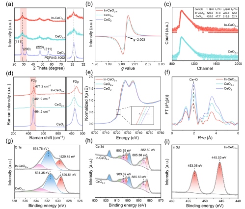 2. CeO2CeO2-xIn-CeO2-x(a)XRD谱图和(b)EPR图谱。(c) CeO2-xIn-CeO2-xPALS光谱。CeO2CeO2-xIn-CeO2-x(d)拉曼光谱、(e)归一化Ce L3边缘XANES(f) FT-EXAFSCeO2-xIn-CeO2-x的高分辨率(g) O 1s(h) Ce 3d(i) In 3d XPS光谱。