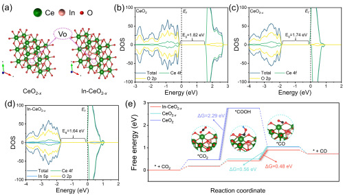 4. (a) CeO2-x和In-CeO2-x的晶体结构其中绿色、粉色和红色球代表CeInO原子。(b–d) CeO2 (b)CeO2-x (c)In-CeO2-x (d)DOS(e)原始CeO2、CeO2-x和In-CeO2-x催化CO2转化为CO时中间体的吉布斯自由能(ΔG)图。